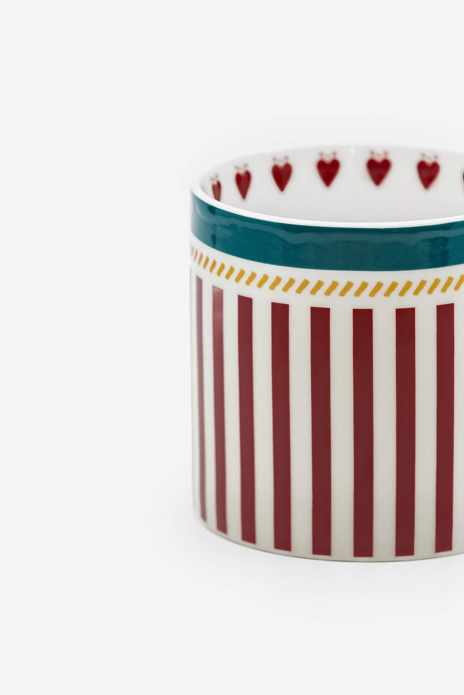 Duo de mugs de Noël en porcelaine fine à motifs variés (boules de noel, rayures) intérieur orné d'un liseré de petits cœurs rouges ou d'un liseré doré.