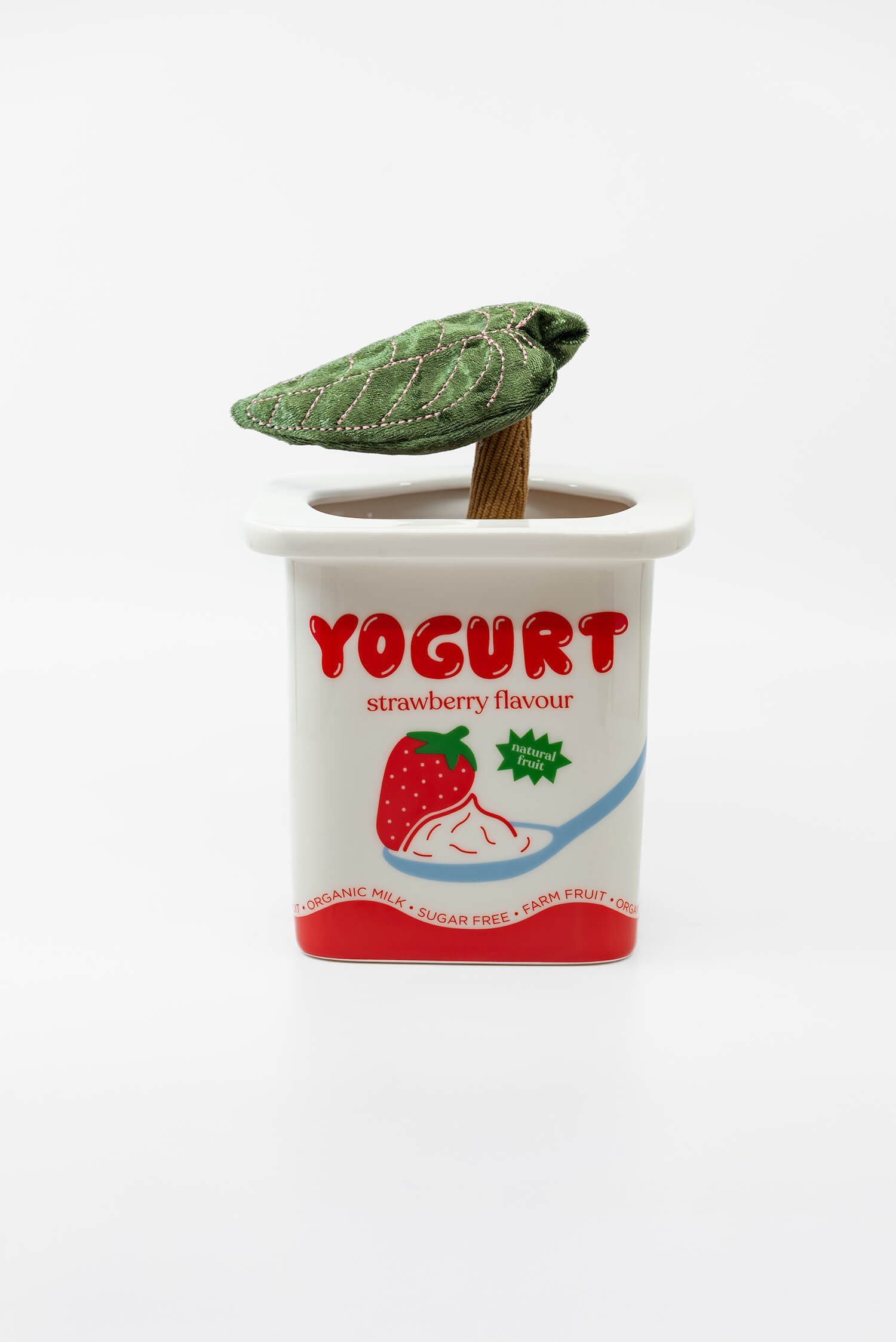Fluid Market s’inspire et s’amuse des objets du quotidien iconiques. Ici, un vase en céramique, clin d’œil gourmand au yaourt à la fraise.