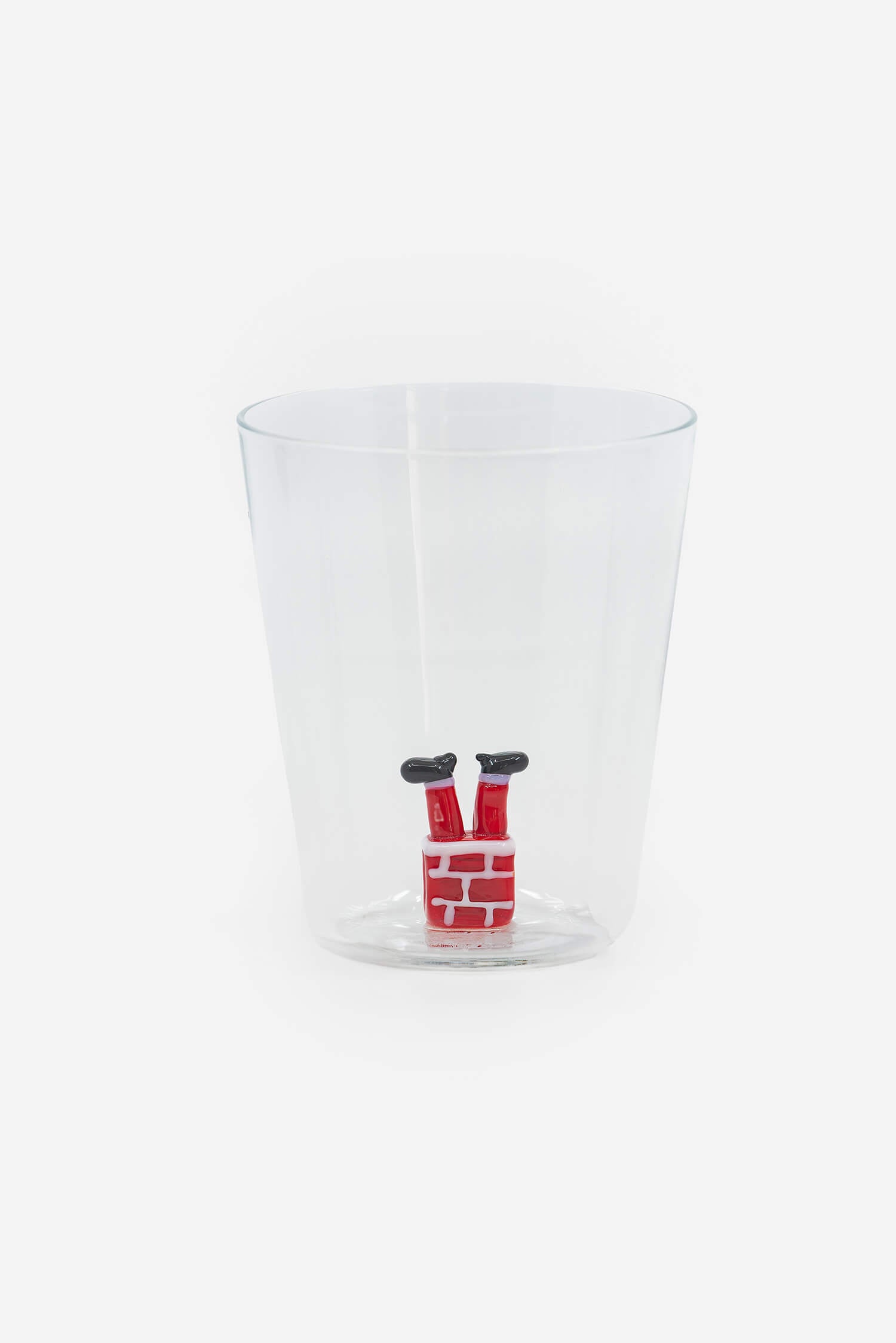Verre à eau transparent orné d’un Père Noël coincé…tête la première dans une cheminée. Idéal pour votre décoration de table Noël.